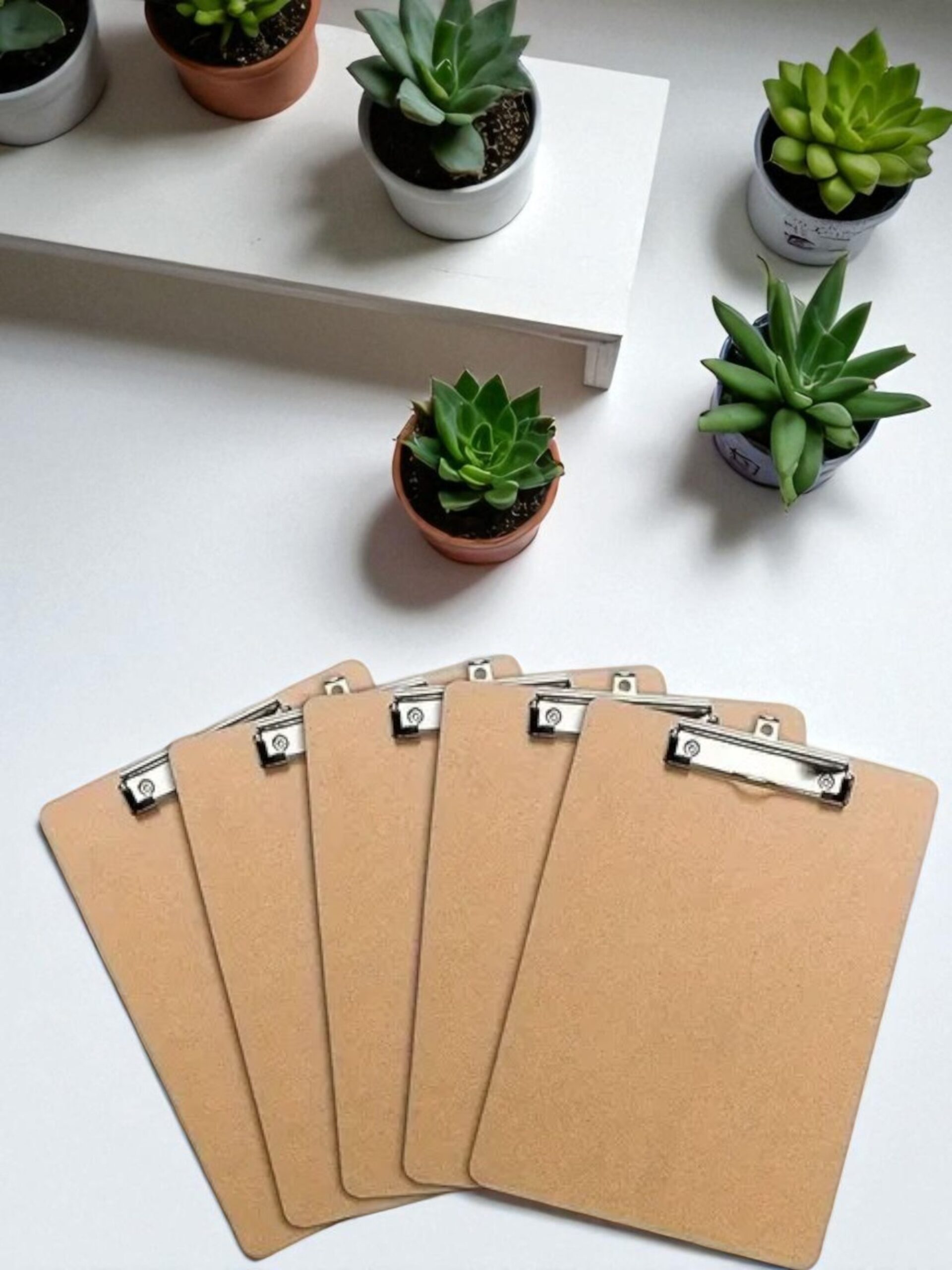 Tabla de apoyo en madera con clip metálico, disponible en tamaño carta y oficio. Ideal para brindar una superficie firme al escribir o sujetar documentos en oficina, estudio o trabajo de campo. Práctica, resistente y portátil.